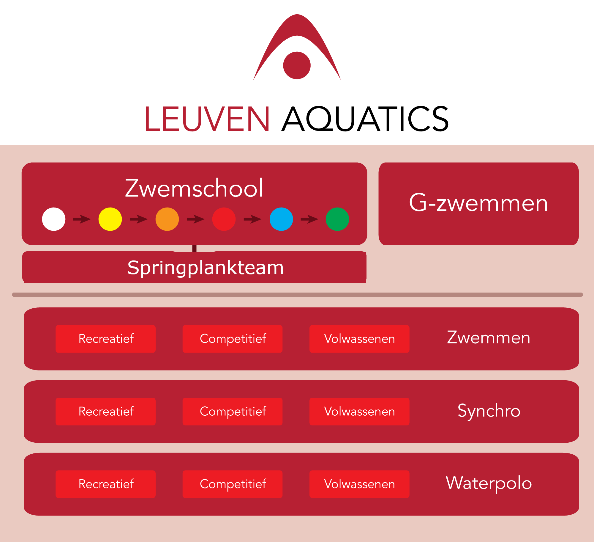 Met Leuven Aquatics kies je bewust voor kwaliteit, al meer dan 100 jaar! We trachten ons aanbod steeds te vergroten en te verbeteren zonder daarbij het familiegevoel, eigen aan een club, te vergeten. We zijn ervan overtuigd dat dit ertoe bijdraagt dat je graag komt zwemmen, dat je vlotter leert, dat je honger krijgt naar meer. En dat bieden we: zwemmen, synchroonzwemmen en waterpolo zijn onze drie peilers, maar wie wil kan ook lesgever worden, zelf de club helpen besturen, een taakje op zich nemen,...